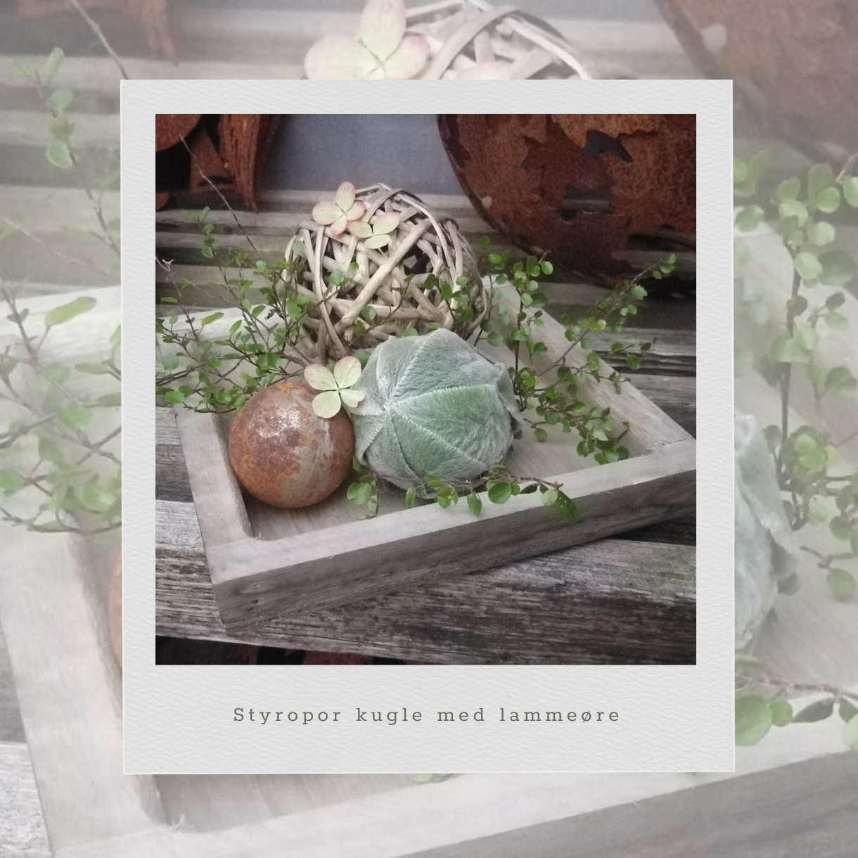 Her er brugt en styropor kugle, knapnåle og lammeøre fra haven til at lave den smukke bløde grønne kugle, de er lagt i et træfad sammen med en rustkugle og grenkugle, et par grene med pletter i luften og små blomsterhoveder fra hortensia.