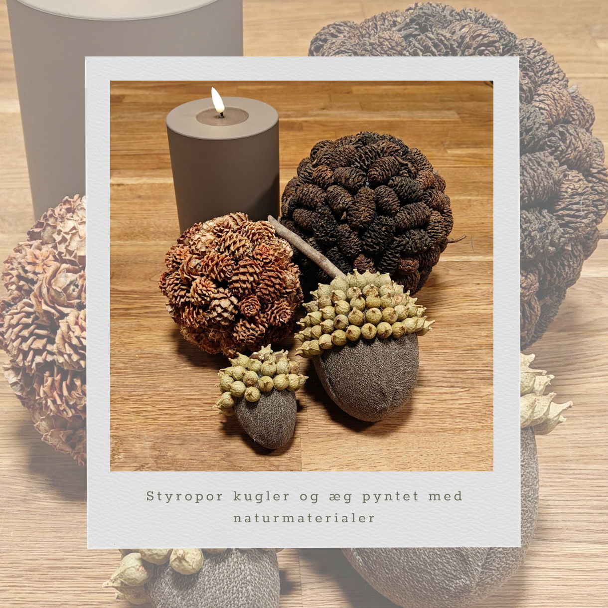 Styropor kugler der er limet forskellige naturmaterialer på, som ellekogler og salignum kogler, de 2 forreste er styropor æg der er limet et stykke stof på og derefter eucalyptus frøstande på og en gren i toppen så de ligner et agern.