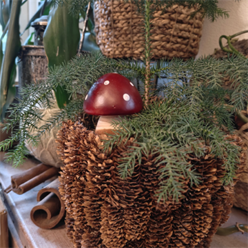 Svampen er et dekorativt element, der kan anvendes år efter år – perfekt til juledekorationer, kranse, nissedøre eller som hyggelig pynt på julebordet.