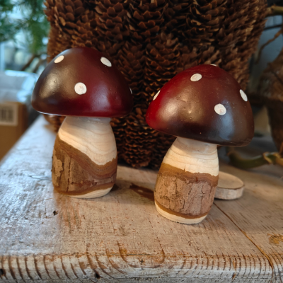 Smuk og klassisk dekorationssvamp i elegant bordeaux farve med naturfarvet fod og hvide prikker. Svampen måler ca. 9 cm og er ideel til både juledekorationer, adventsarrangementer, vinterpynt og kreative binderiprojekter.