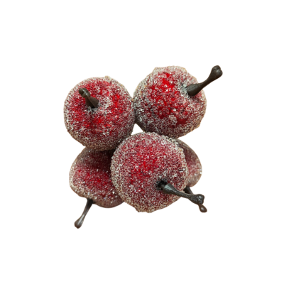 Dekorative røde æbler med let frostet overflade. Hvert sæt indeholder 5 æbler, som måler ca. 2,5 cm i diameter og har en stilk på ca. 10 cm. Perfekte til juledekorationer, kranse, bordpynt og kreative projekter. De realistiske detaljer og den fine frost-effekt giver et naturligt og stemningsfuldt udtryk.​​​​​​​
