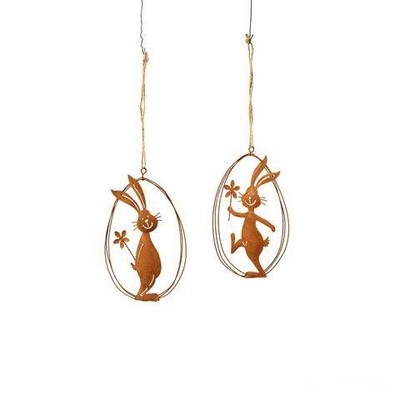Dekorative harer i rustfarvet metal, 14 cm høj. Perfekt som uro eller pynt i hjemmet, haven eller til særlige lejligheder. Fremstillet af holdbart metal med rusteffekt, der giver et charmerende, naturligt udtryk. Bemærk, at rust kan smitte af.