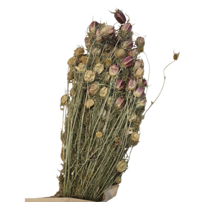 Smukt tørret bundt af Jomfru i det grønne i naturlige nuancer. Perfekt til dekoration, buketter og kreative blomsterarrangementer året rundt.