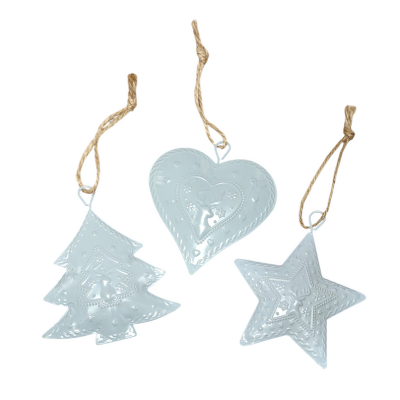 Dekorativt sæt med tre lyseblå ophæng i metal – hjerte, stjerne og juletræ. Hver figur måler ca. 10 cm i højden og 9 cm i bredden og leveres med snor til ophæng. Perfekt som naturlig julepynt, gavepynt eller rustik dekoration året rundt.