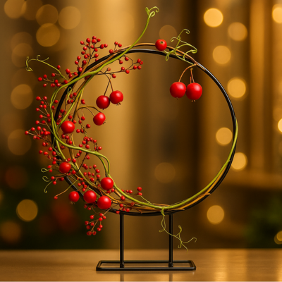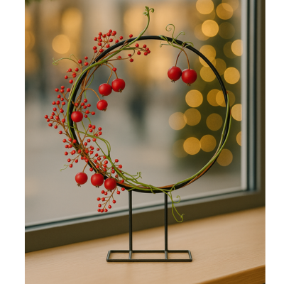 Denne standring er fremstillet i robust metal og har et minimalistisk design, der passer til både moderne og klassiske miljøer. Den kan dekoreres med tørrede blomster, gran, mos, lyskæder, bånd eller årstidens pynt – kun fantasien sætter grænser.