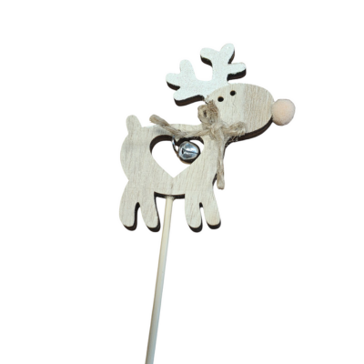 Dekorativ rensdyrfigur med lille bjælde, monteret på splitbambus. Perfekt til juledekorationer, kranse og vinterpynt i naturtro stil.