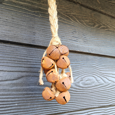 Smukt rustikt ophæng med 12 små bjælder i antik metalfinish. Bjælderne hænger i en grov jutegarnssnor, der giver et naturligt og nostalgisk udtryk.