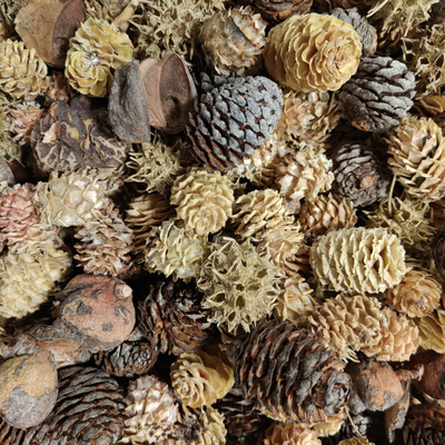 Naturlig sampak med blandede kogler i forskellige størrelser og former. Ca. 200 stk. pr. kasse – perfekt til dekorationer, kranse og naturpynt.