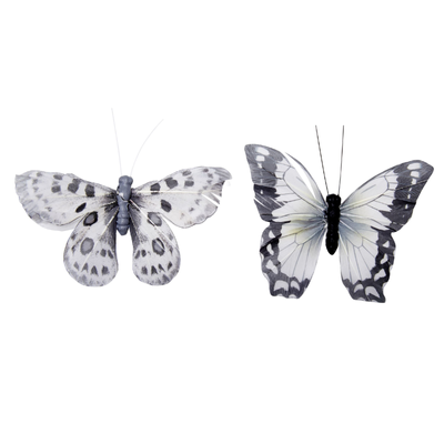 Sæt med to dekorative sommerfugle i sorte og hvide nuancer. Monteret på tynde tråde, så de nemt kan sættes i dekorationer og buketter. Udseendet kan variere let fra sæt til sæt.