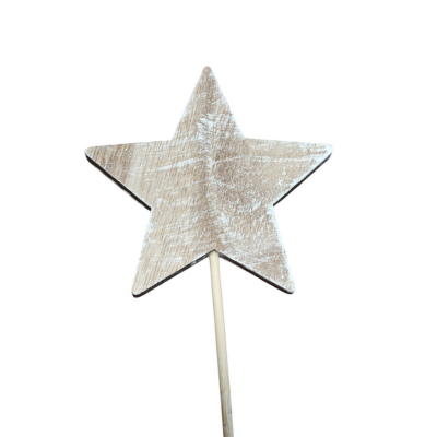 Smuk dekorationsstjerne i træ med naturligt og let patineret udtryk, monteret på splitbambus. Stjernen måler ca. 8x8 cm og passer perfekt til både klassisk og nordisk julepynt.