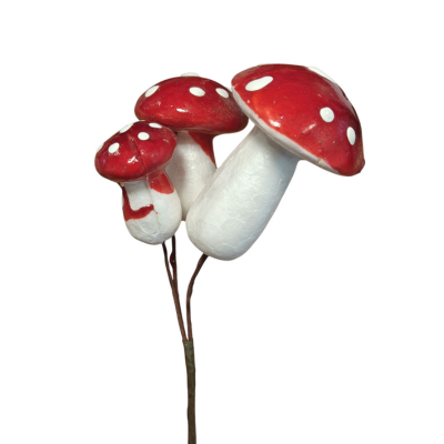 Dekorative svampe i klassisk rød og hvid farve, lavet i flamingo og monteret på metaltråd, så de nemt kan sættes i dekorationer. Hver svamp måler ca. 3, 3,5 og 5 cm i højden og 2, 3 og 3,5 cm i diameter.