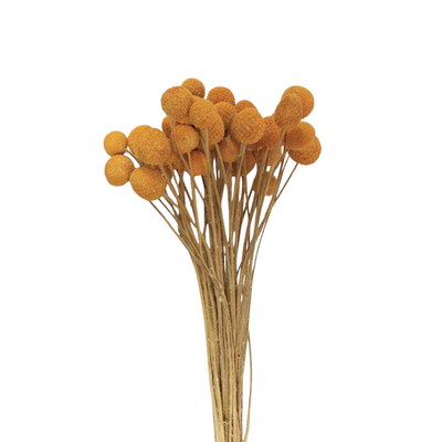 Tørret Craspedia, også kaldet trommestikker, i smuk gyldengul farve. Bundt med ca. 40 stilke. Perfekt til buketter, kranse og dekorationer.
