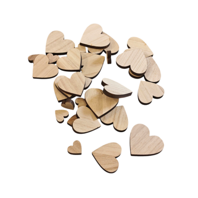 Dekorative hjerter i rustik træfarve, 30 stk. i tre størrelser. Perfekt til dekoration, binderi og kreative projekter.